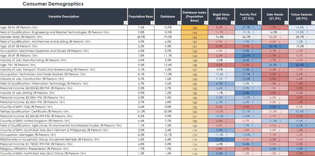 Upload a sanitised sample of your customers, select your Human Insights data categories, and get a comprehensive profiling package in under five minutes – including an Excel report, an AI-Ready Profile, and market base counts for opportunity sizing. The report shows how your customer base indexes against population benchmarks, plus detailed profiles of any segments or buyer groups you define. The AI-Ready Profile is optimised for uploading directly into AI tools like Claude or ChatGPT.